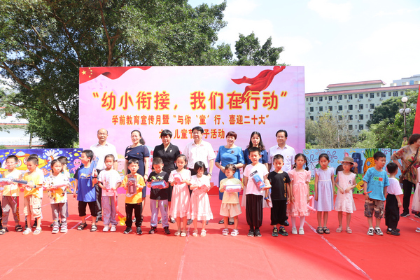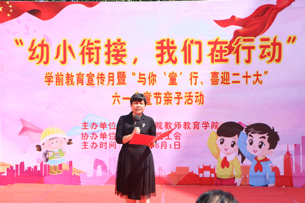 在“二十大”即将召开和“六一”儿童节来临之际,为了让幼儿和家长过一个快乐、祥和的节日,广泛宣传科学的幼小衔接理念,推动科学的幼儿家庭教育,6月1日下午,由金沙威尼斯欢乐人城主办、学校工会协办的“幼小衔接,我们在行动” 学前教育宣传月暨 “与你‘童’行、喜迎二十大” 六一儿童节亲子活动在艺馨楼广场隆重举行。金沙威尼斯欢乐人城党委书记李新富、院长邓琴,学校工会常务副主席蓝色,学院其他领导及教师、学前教育专业学生,小朋友们和家长到场参加了活动。